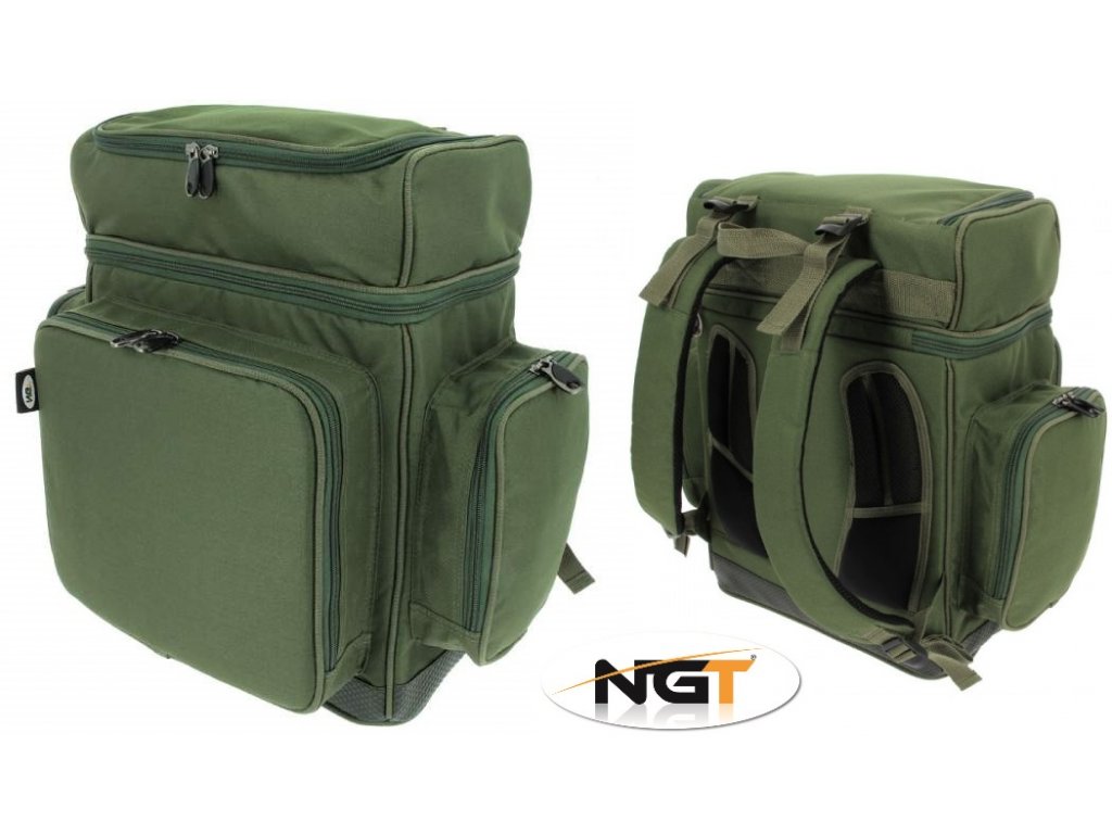 Zelený rybářský batoh NGT XPR Rucksack s objemem 50 litrů, polstrovanými popruhy, integrovanými kapsami a vyztuženou zádovou částí.