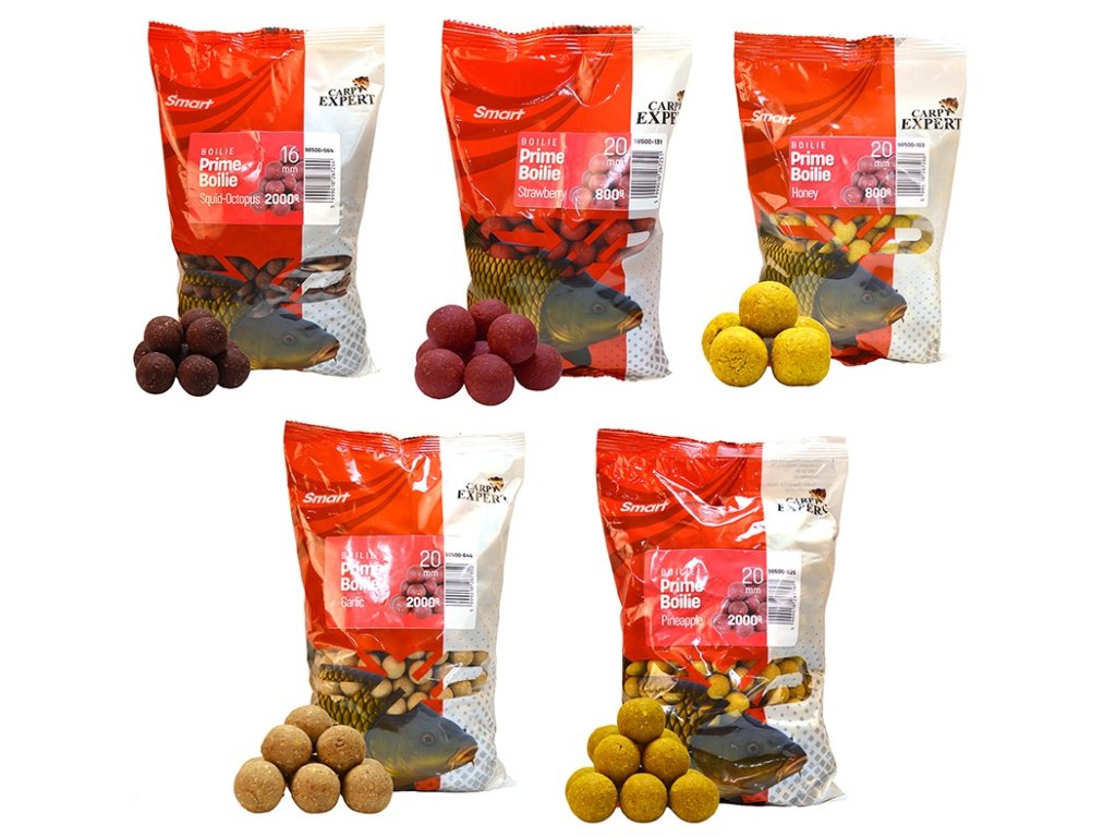 Boilies CARP EXPERT SMART PRIME BOILIE jsou dostupné v průměru 16 mm a 20 mm, v balení 2000 g. Jsou určeny do situací, kde je důležitá všestrannost a stabilní výkon. Průměr 20 a16 mm je velmi vhodný pro zakrmování, samostatně nebo v kombinaci s krmnou směsí, partiklmi a magmixy, při vnášení ve formě koulí i při přesném zakrmování pomocí rakety nebo spombu.