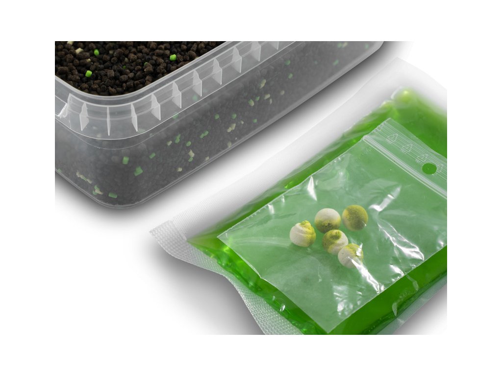 Základ krmné směsi tvoří mikro pelety bohaté na bílkoviny v kombinaci s ochucenými peletkami. Tato kombinace aktivně šíří potravní signál a okamžitě stimuluje smysly ryb v okolí. Díky vyladěnému složení je tento set vhodný pro celoroční lov. Zaboostrované mikropeletky můžete stejně dobře využít i do PVA sáčku či síťky.