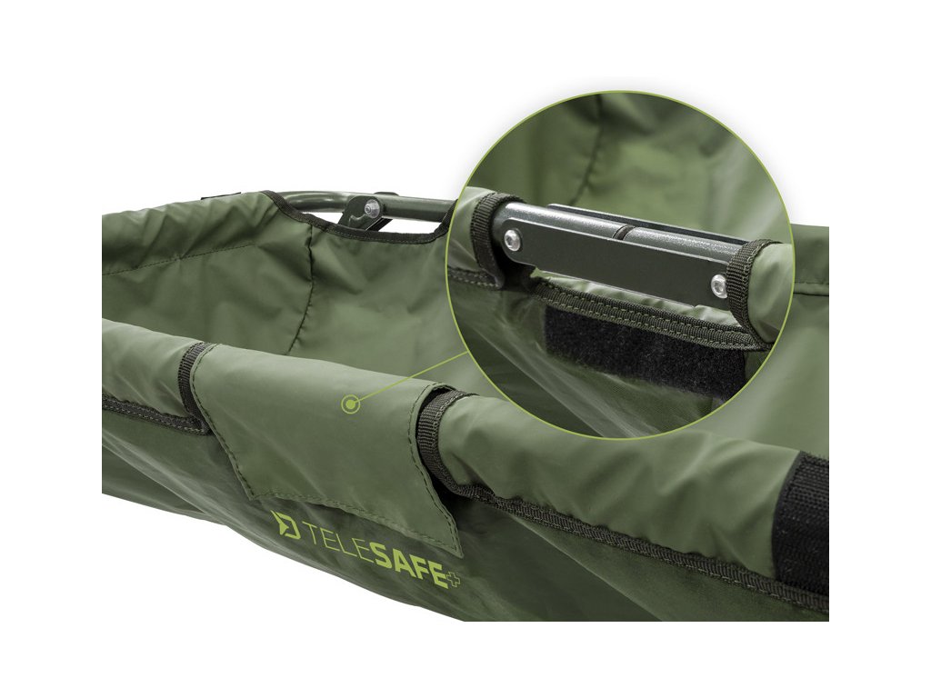Základ vaničky TeleSAFE+ je tvořen pevnou železnou konstrukcí o průměru trubek až 22 mm. Použitá látka s pogumovaným povrchem má také několik výhod. Po ukončení lovu ji stačí do sucha vytřít a není tak nutné dlouho čekat než vyschne. Navíc je velmi lehce omyvatelná a neabsorbuje do sebe nepříjemné pachy, které se mohou následně šířit při transportu ve vašem autě. Celá vanička je velmi pevná a při extrémních testech bez problémů zvládla udržet statické závaží o váze až 75kg! Na obou krajích je všitá síťková látka, přes kterou zevnitř lehce odteče voda. TeleSAFE+ disponuje také látkou na překrytí, která je opatřena suchými zipy. Můžete tak v ní rybu uzavřít, pokud si například potřebujete připravit fotoaparát, případně jít nabrat vodu k polití úlovku. Teleskopické nohy jsou opatřeny kloubovými patkami, které se přizpůsobí terénu a zamezí zaboření do země v případě měkčího podkladu. Při navrhování jsme však mysleli také na transport, což je další silná stránka tohoto produktu. Ve středu je konstrukce důmyslně předělená, a tak ji stačí jednoduše přeložit napůl a pomocí rukojetí pohodlně přenášet.