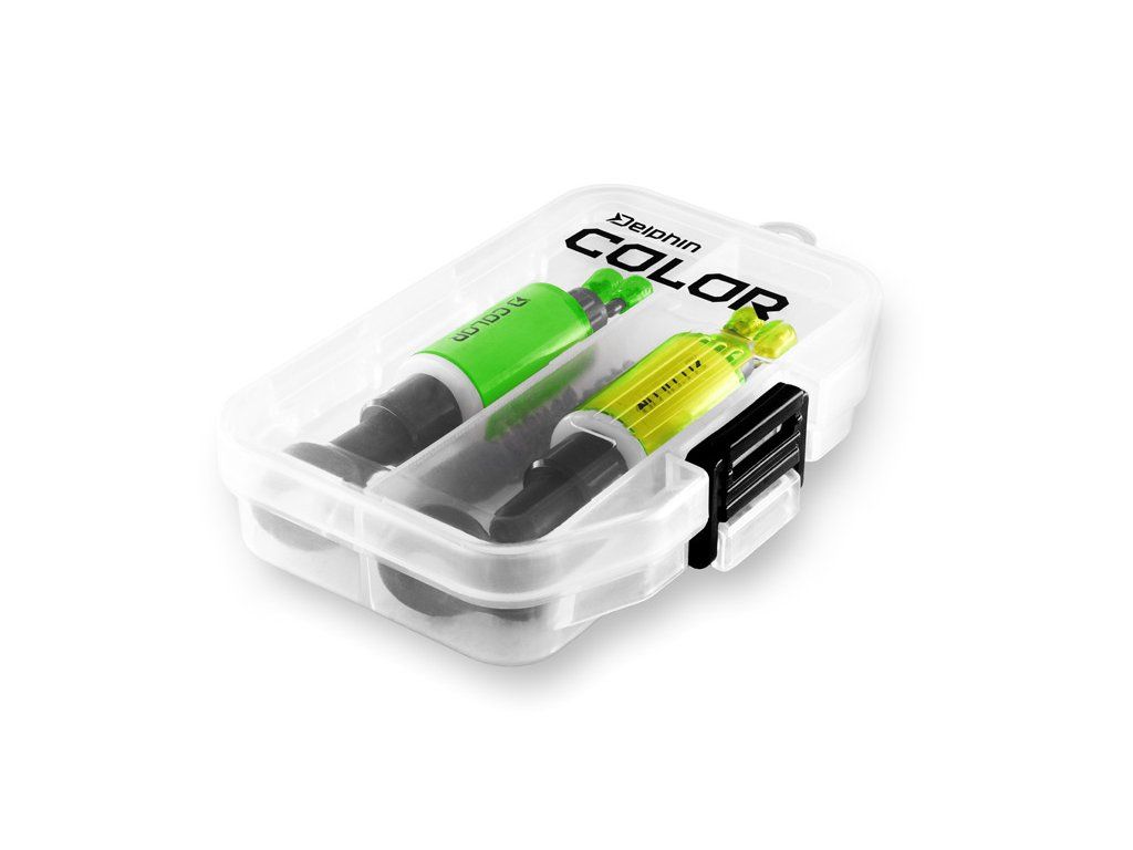 Sada Delphin COLOR je dodávána v praktické uzavíratelné krabičce, která chrání indikátory před poškozením během transportu a usnadňuje jejich přehledné uložení v rybářské tašce. Na výběr je balení v kombinaci modrá/červená nebo žlutá/zelená barva.
