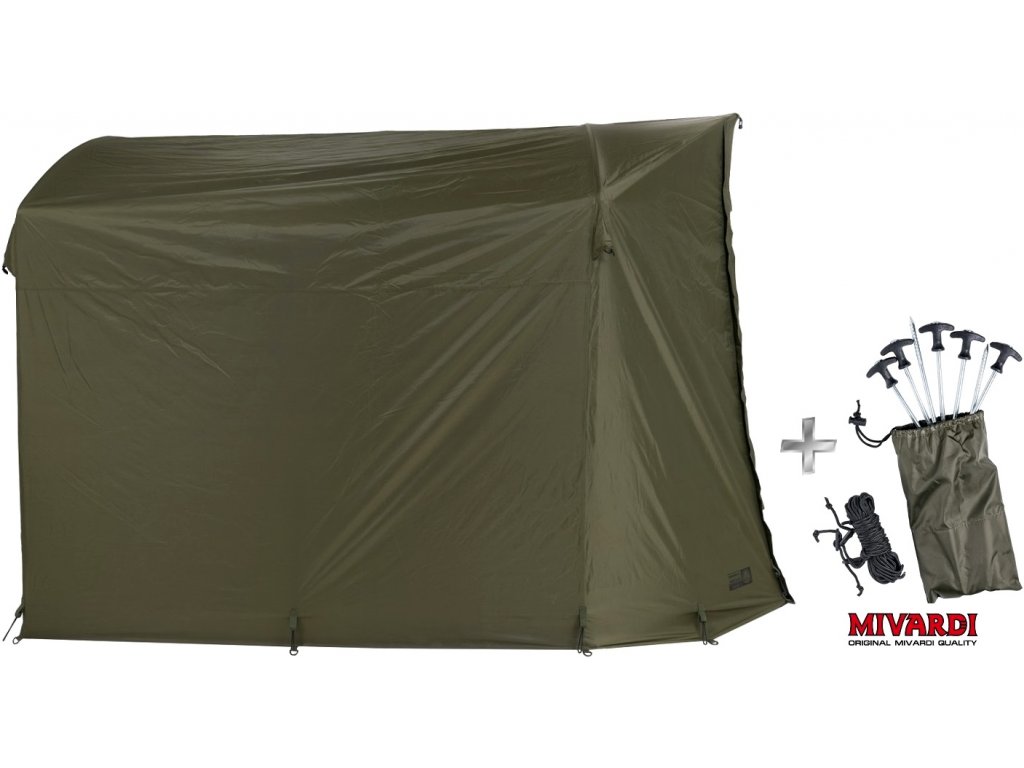 Přehoz na přístřešek Mivardi Base Station se zatloukacími kolíky a přídavnými kotvícími šňůrami.